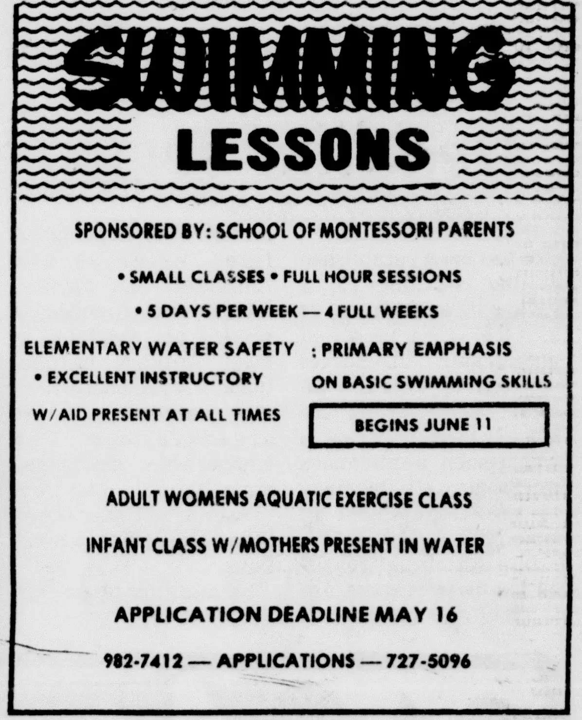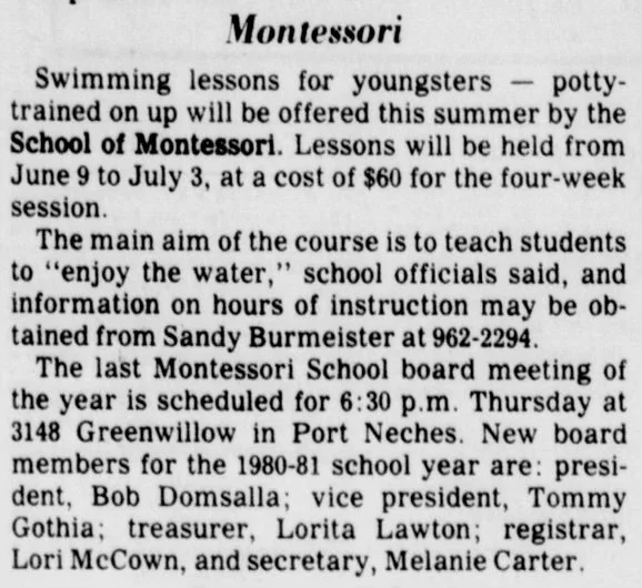 From 1979 to 1983 The School of Montessori parents offered swimming lessons to the public.