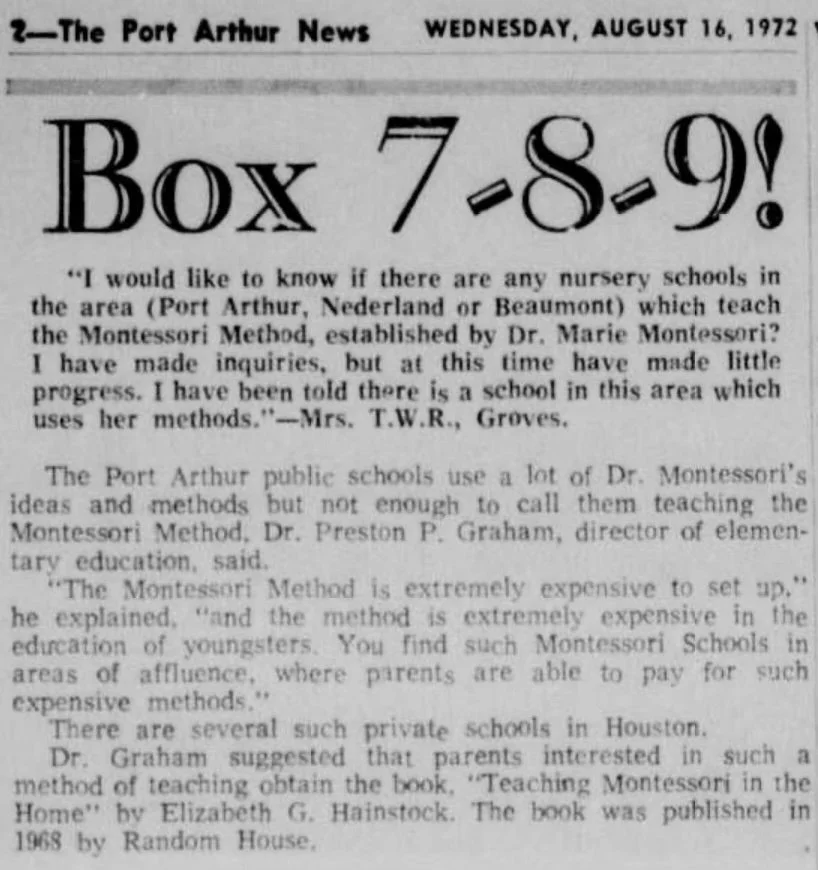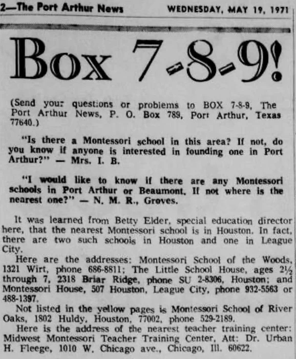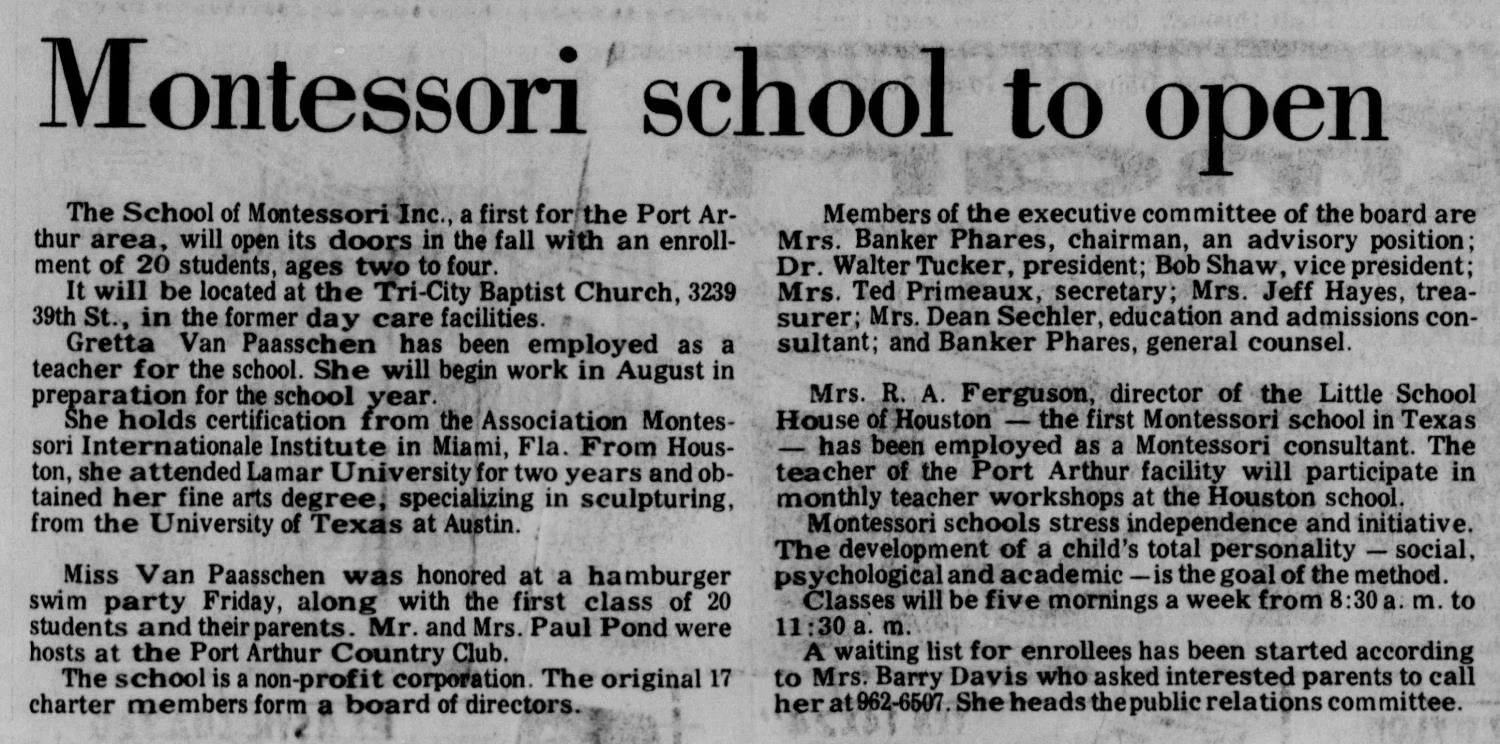 Interest in the Montessori philosophy was growing in the region and in 1972 letters to the editors searched for a Montessori school in the Golden Triangle however, the closest operating school was in Houston (set up 12 years earlier).